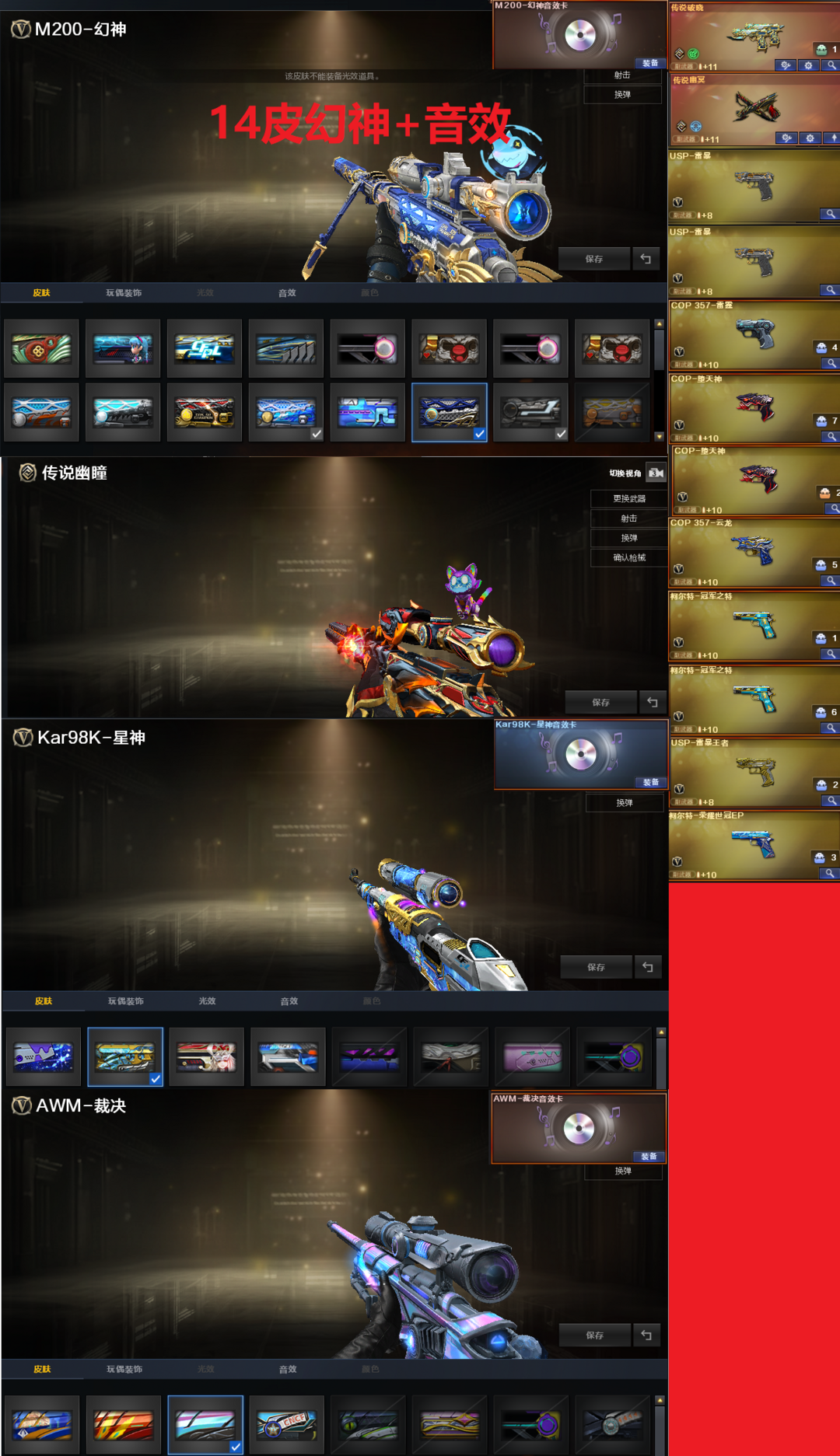 装备描述:排位:可以. ------生化四防极品(可以变更背包、查看生化僵尸血量):无需换弹、6烈、6盘、炼狱+音效、炼狱-泡泡象、斯太尔蝴蝶、斯太尔枪娘暗刃、死亡之眼、MAC-涂鸦、4把炽芒蝶刃、手斧镜、生化减速雷、超级对讲机、全部弹匣、、、、、、爆破四防:幻神14皮+音效(YZK、KZ、EP荣耀、电竞之星、降龙、白鲨、冠军之幻、电流骇客、宠儿、N9、星火小队、23白鲨、AG、电竞之星皮肤)、98K星神、传说幽瞳、M200-竞技荣光、王者幻神、M200-喜狮迎春、王者风神、98K星神、、、、传说破晓、传说幽冥、2个USP雷暴、2个COP堕天神、COP云龙、2个冠军之特、USP雷暴王者、EP荣耀柯尔特、传说暗裔、G36幻影、白虎、QBZ金色蔷薇、、、幻神音效、裁决音效、星神音效、炼狱音效、火麒麟音效、白虎音效、蔷薇音效、极光音效、、、全套手雷、、、生化四防(传说影煞、隼、礼物老人)、爆破四防(妮妮、关小雨、晴雅、星际战将、鹰、岚兮儿、王者貂蝉、王者刀锋、王者潘多拉)