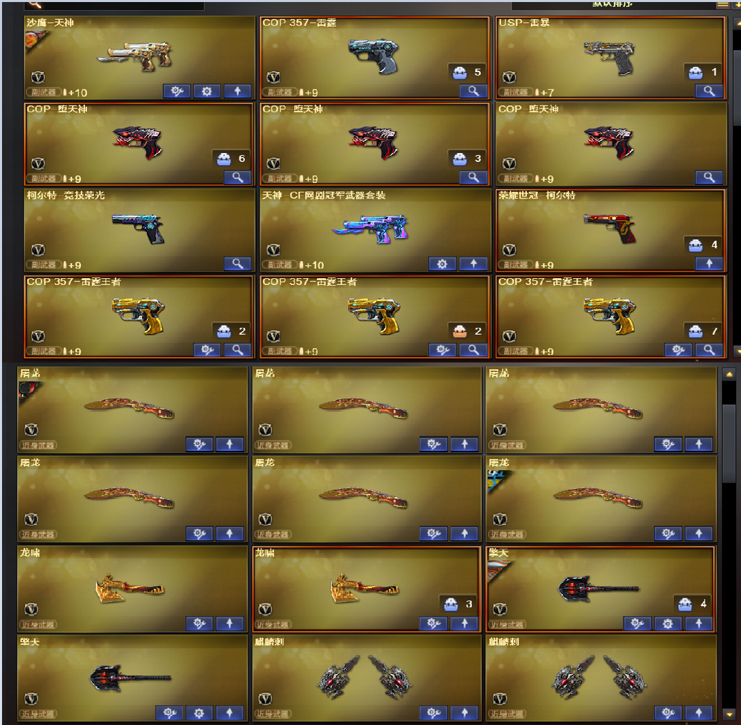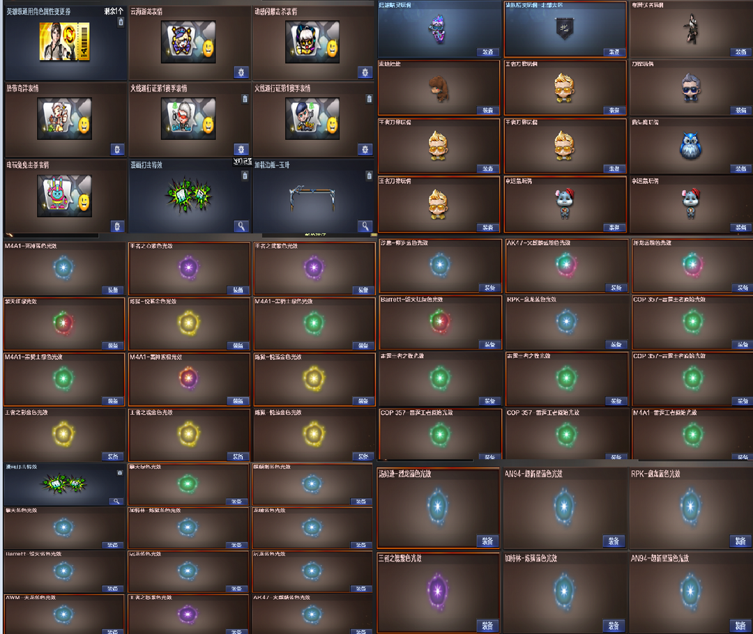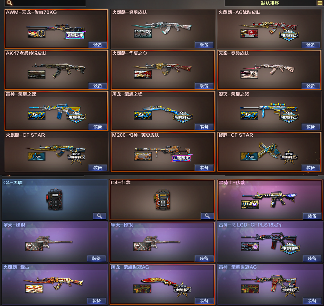装备描述:王者武器:王者之锋-觉醒版;王者之武-觉醒版;王者炎心-觉醒版;炼狱-悦蓝-觉醒版;COP 357-雷霆王者-觉醒版;高爆手雷-雷霆王者;雷霆王者之锋-觉醒版;M4A1-雷霆王者-觉醒版;Barrett-雷霆王者-觉醒版;烟雾弹-雷霆王者-觉醒版;闪光弹-雷霆王者-觉醒版;高爆手雷-雷霆王者;王者幻神-觉醒版;炫金毁灭;王者之心-觉醒版;王者之锋;炫金骑士;王者之魂;王者之啸-觉醒版;王者之魄-觉醒版;炫金雷神;王者之武;炼狱-悦蓝;王者之怒;王者之戮 英雄武器:机械迷城-穹宇;高爆手雷-竞技荣光;烟雾弹-竞技荣光;闪光弹-竞技荣光;雷霆之契;M200-竞技荣光;柯尔特-竞技荣光;擎天-竞技荣光;荣耀世冠-龙啸;荣耀世冠-柯尔特;RPK-盘龙;HK417-朱雀;QBZ03-金色蔷薇;Scar Light-白虎;黑骑士-海王;AK47-雷暴;USP-雷暴;斩神刀-雷暴;汤姆逊-烈龙;沙鹰-修罗;麒麟刺;AWM-裁决;天神-CF网剧冠军;黑武士-CF网剧冠军;擎天-CF网剧冠军;M4A1-黑骑士;加特林-炼狱;M4A1-千变;AK12-天启;AWM-天龙;沙鹰-天神;M4A1-龙血;AK4