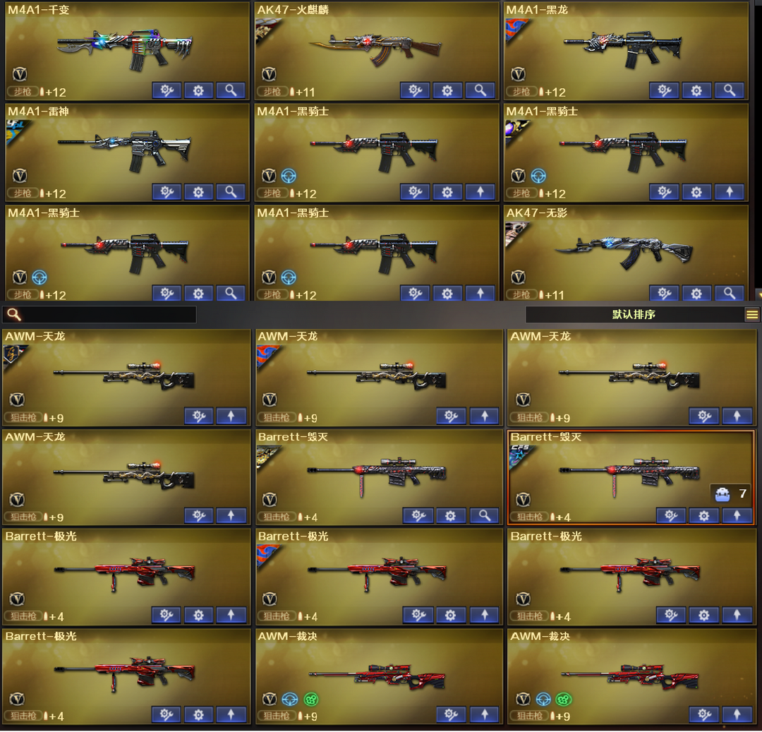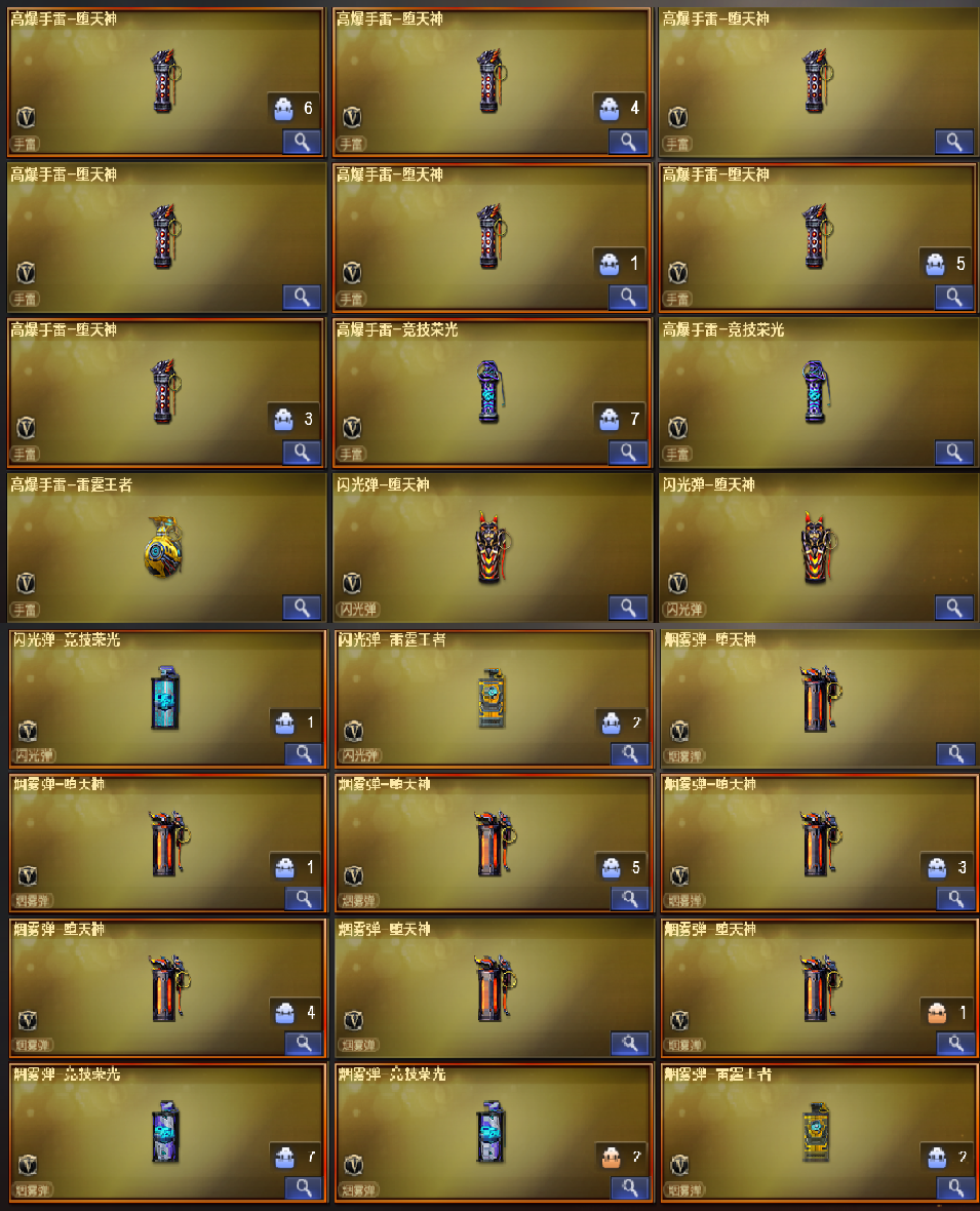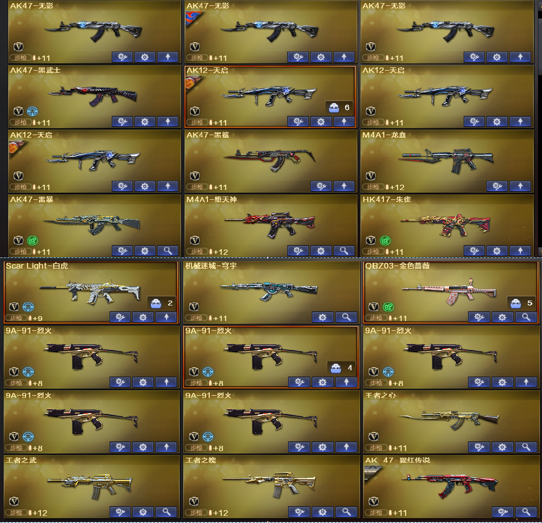 装备描述:王者武器:王者之锋-觉醒版;王者之武-觉醒版;王者炎心-觉醒版;炼狱-悦蓝-觉醒版;COP 357-雷霆王者-觉醒版;高爆手雷-雷霆王者;雷霆王者之锋-觉醒版;M4A1-雷霆王者-觉醒版;Barrett-雷霆王者-觉醒版;烟雾弹-雷霆王者-觉醒版;闪光弹-雷霆王者-觉醒版;高爆手雷-雷霆王者;王者幻神-觉醒版;炫金毁灭;王者之心-觉醒版;王者之锋;炫金骑士;王者之魂;王者之啸-觉醒版;王者之魄-觉醒版;炫金雷神;王者之武;炼狱-悦蓝;王者之怒;王者之戮 英雄武器:机械迷城-穹宇;高爆手雷-竞技荣光;烟雾弹-竞技荣光;闪光弹-竞技荣光;雷霆之契;M200-竞技荣光;柯尔特-竞技荣光;擎天-竞技荣光;荣耀世冠-龙啸;荣耀世冠-柯尔特;RPK-盘龙;HK417-朱雀;QBZ03-金色蔷薇;Scar Light-白虎;黑骑士-海王;AK47-雷暴;USP-雷暴;斩神刀-雷暴;汤姆逊-烈龙;沙鹰-修罗;麒麟刺;AWM-裁决;天神-CF网剧冠军;黑武士-CF网剧冠军;擎天-CF网剧冠军;M4A1-黑骑士;加特林-炼狱;M4A1-千变;AK12-天启;AWM-天龙;沙鹰-天神;M4A1-龙血;AK4
