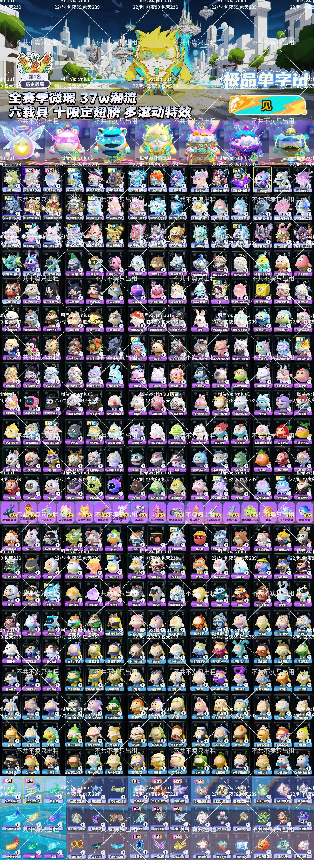 单字id:见|49臻阿存全赛季微瑕|闪电狗园长小丑机甲蓝帽龟鸭护目镜嫦娥|6车10翅膀