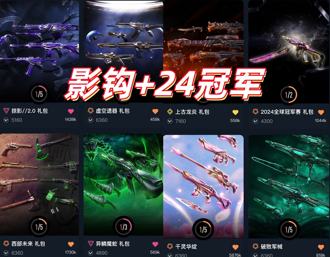 可排✨影钩掠夺爪刀✨24冠军✨落英飞旋✨龙炎虚无苍龙紫金盖亚狂徒✨西部未来✨破败戍卫✨vct标配