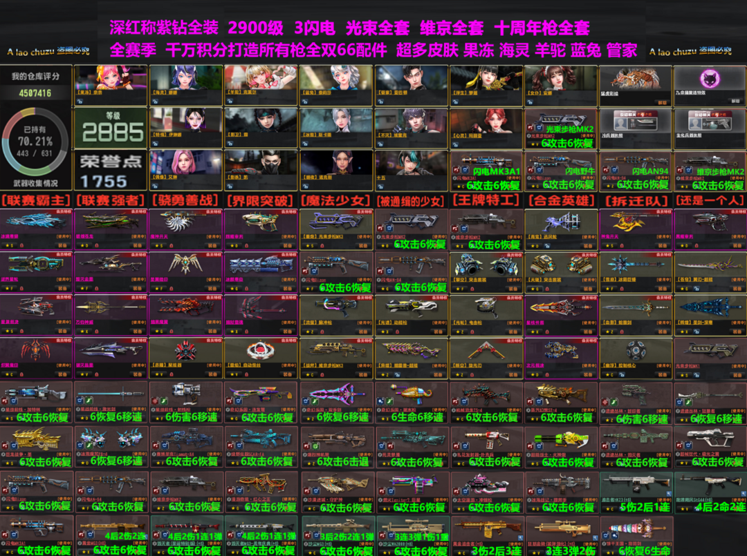 限制: 撤单率<30%才可租用此帐号装备描述:电信一区,粉称全装。紫钻特权全武器全传奇。3100级,光束9星、闪电MG36、闪电MK3A1、闪电野牛、闪电AN94,光束步枪12、维京步枪全套。十周年枪全套。荣誉点2100点,很多绝版荣誉。全赛季。全部双66配件,全部超凡人物,超多皮肤枪。绝版猛虎纹身,狼魂尾巴。全部武器强化,部分极品属性强化。 A佬出租欢迎你的光临!喜欢请收藏店铺,店铺里下单可领红包。 【已去黑雾,画面优化,画质清晰。【欢迎收藏】