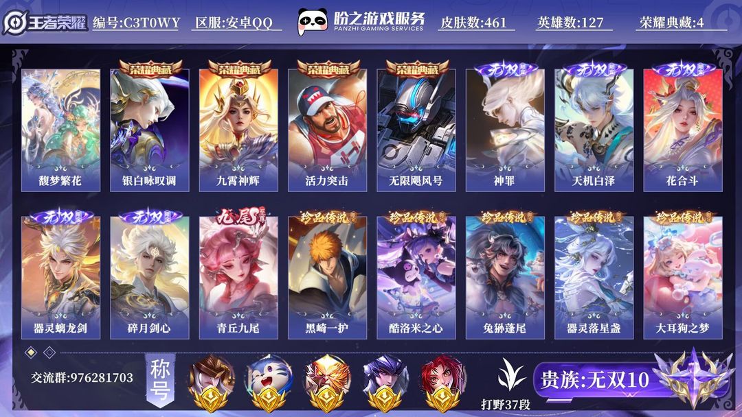 装备描述:【省标10】 贵族无双10 荣耀典藏4 珍品无双1 无双6 珍品传说6 星传说2 传说皮肤78 星元套装26 史诗皮肤136 打野37段 皮肤数量461 天幕5 英雄127 永恒钻石V,累计充值近5万,3快一小时绝对不贵,欢迎来玩