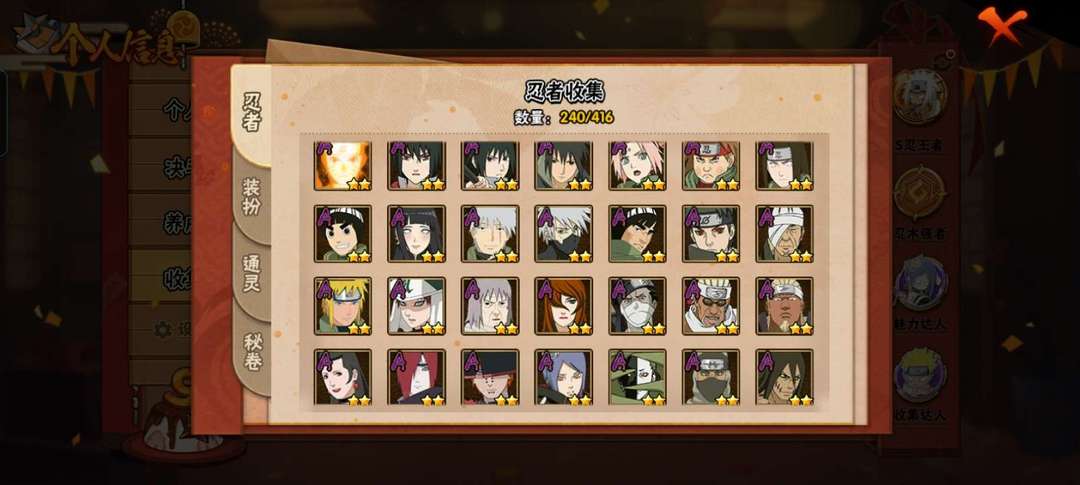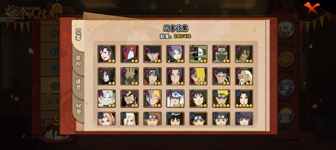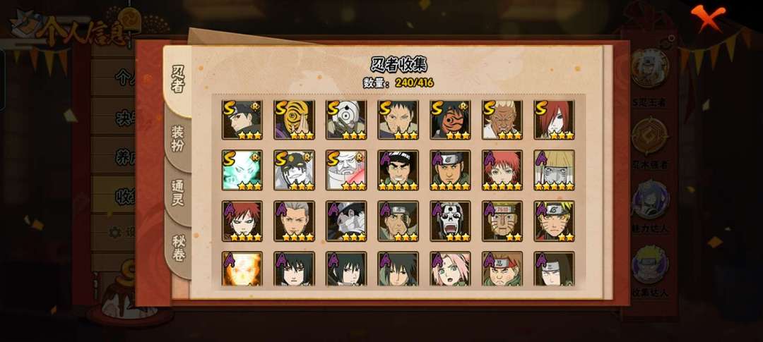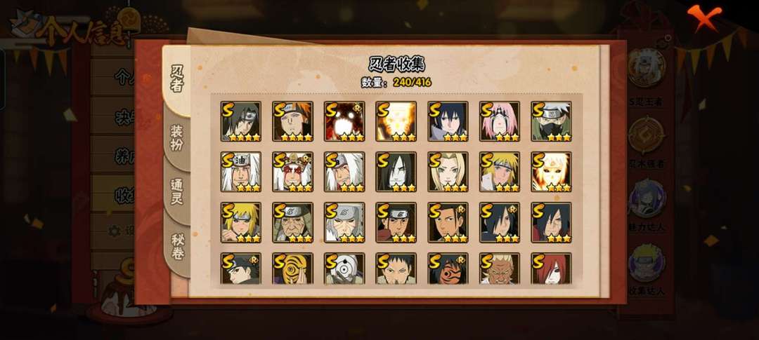 装备描述:32s,鸣人★佐助,忍战带土,须佐止水,暴怒六尾,金身水门,漂泊佩恩,漂泊带土,舍人,木叶创立班