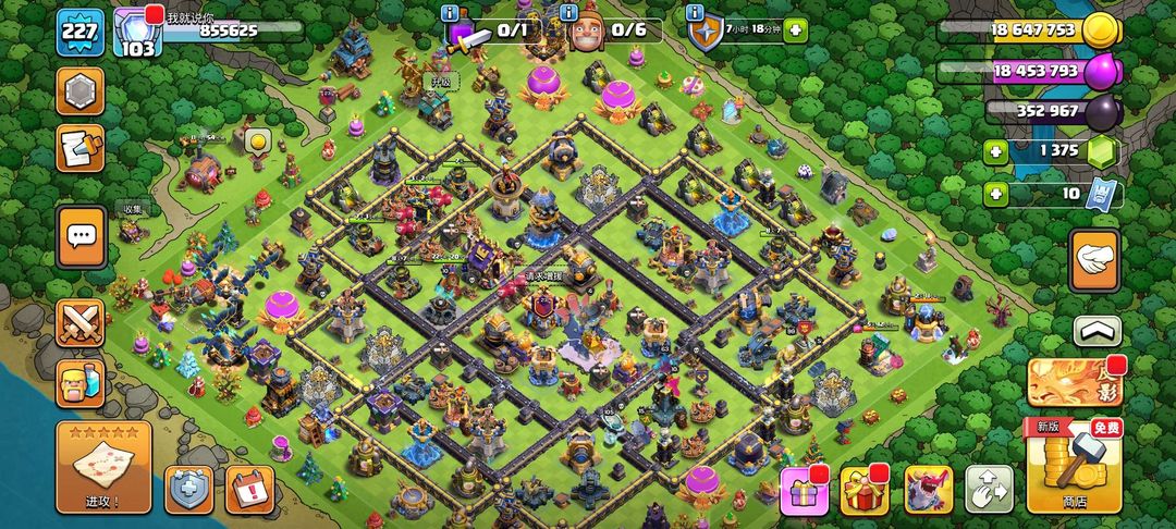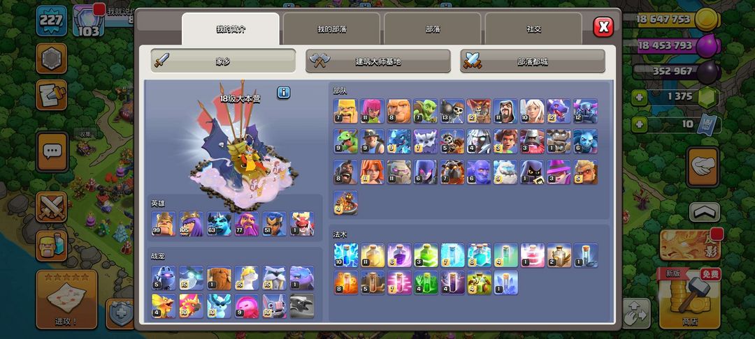 夜世界全满,主世界18本过半,夜世界兵种英雄城墙全满级,103级主世界38级夜世界 欢迎大家