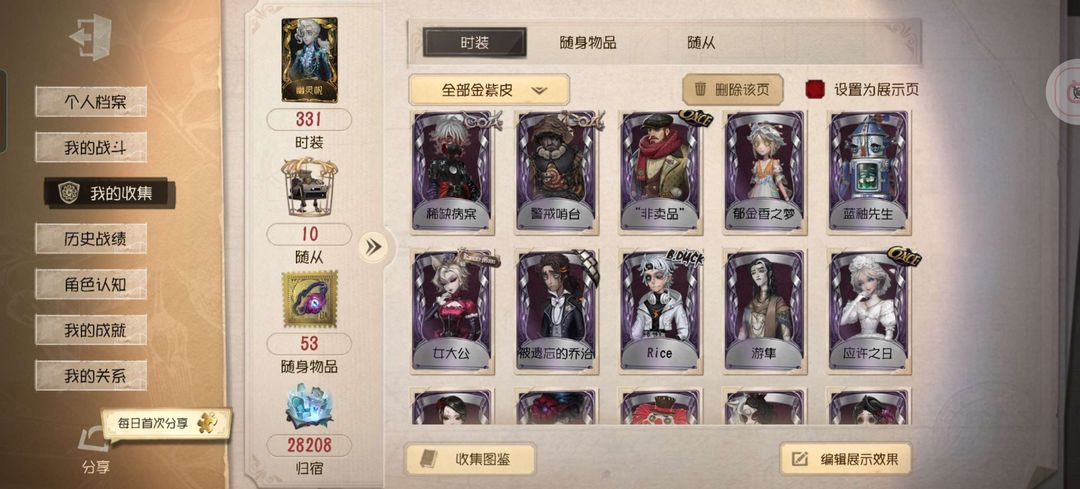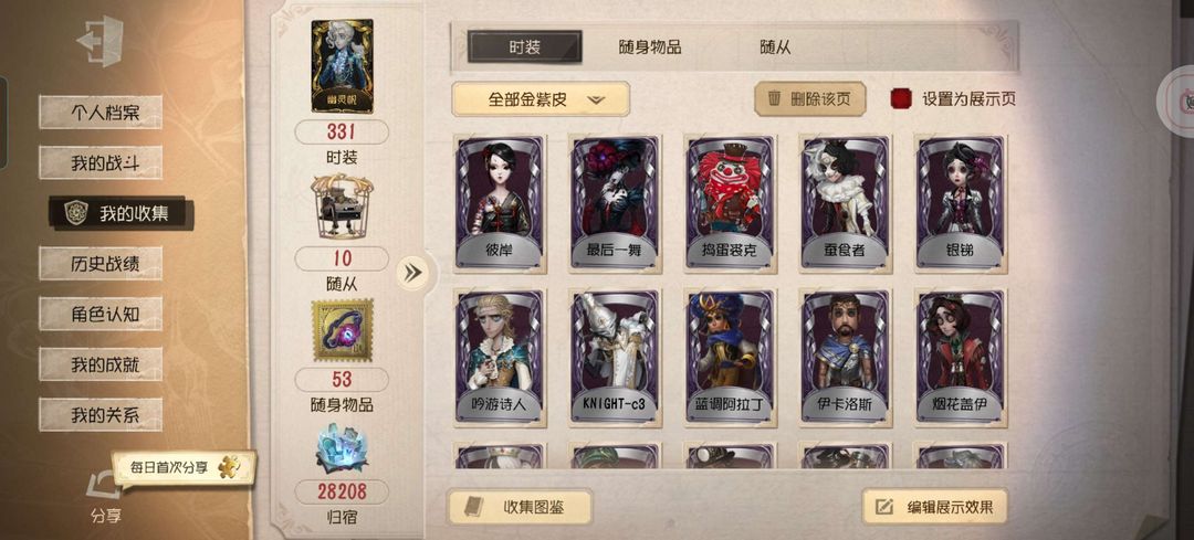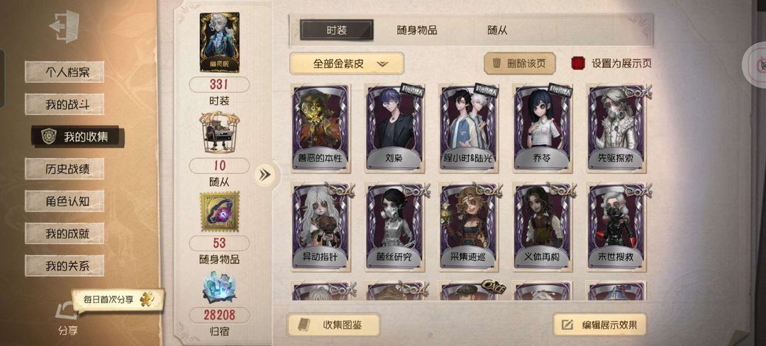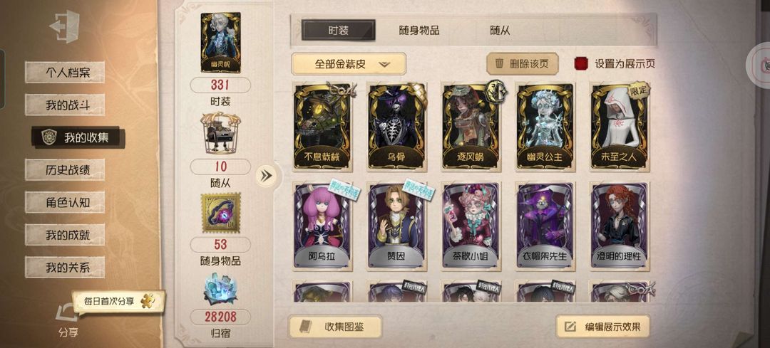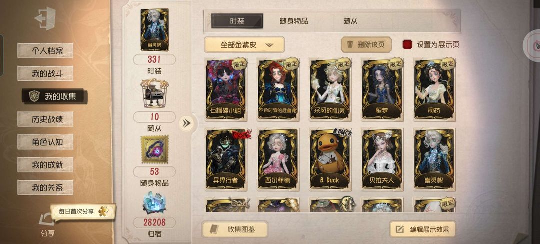 【331个时装,14金皮,其中5限定,59紫皮,53随身物品,6金随身物品,9紫随身物品】